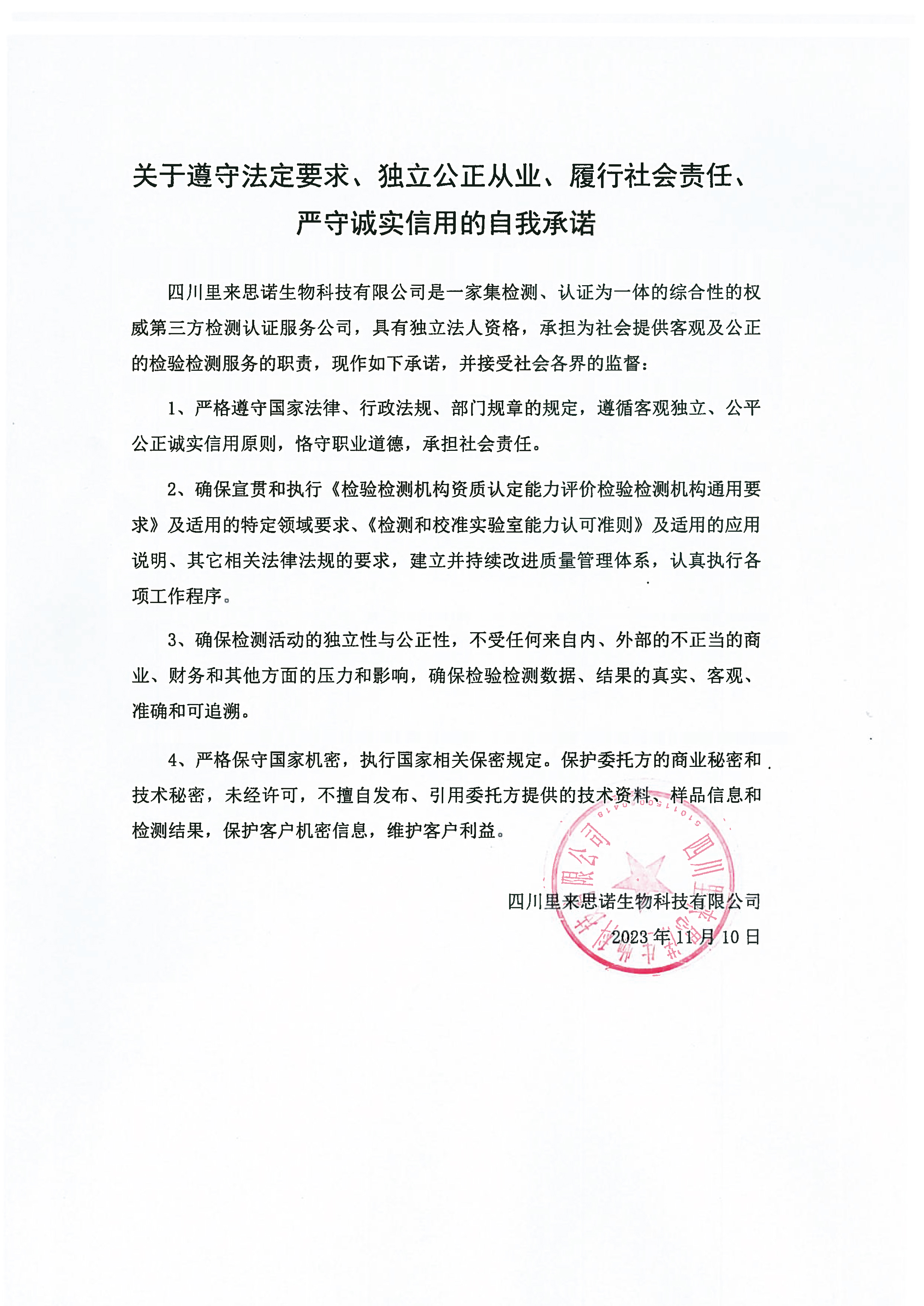 關(guān)于遵守法定要求、獨(dú)立公正從業(yè)、履行社會(huì)責(zé)任、嚴(yán)守誠實(shí)信用的自我承諾