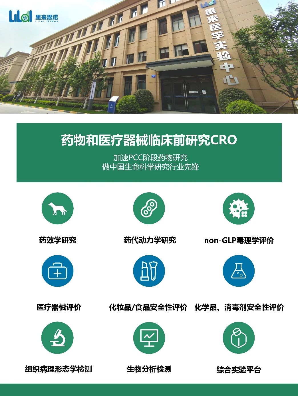 里來思諾成立于2008年,建有7000㎡的高標準藥物研究中心及2.5萬㎡規(guī)范化綜合型動物實驗基地。下設(shè)動物實驗中心、常規(guī)病理實驗中心、超微病理實驗中心、分子與蛋白實驗中心等14個專業(yè)技術(shù)研究與評價中心,是擁有CMA認證的開放式CRO一體化藥物研究平臺。